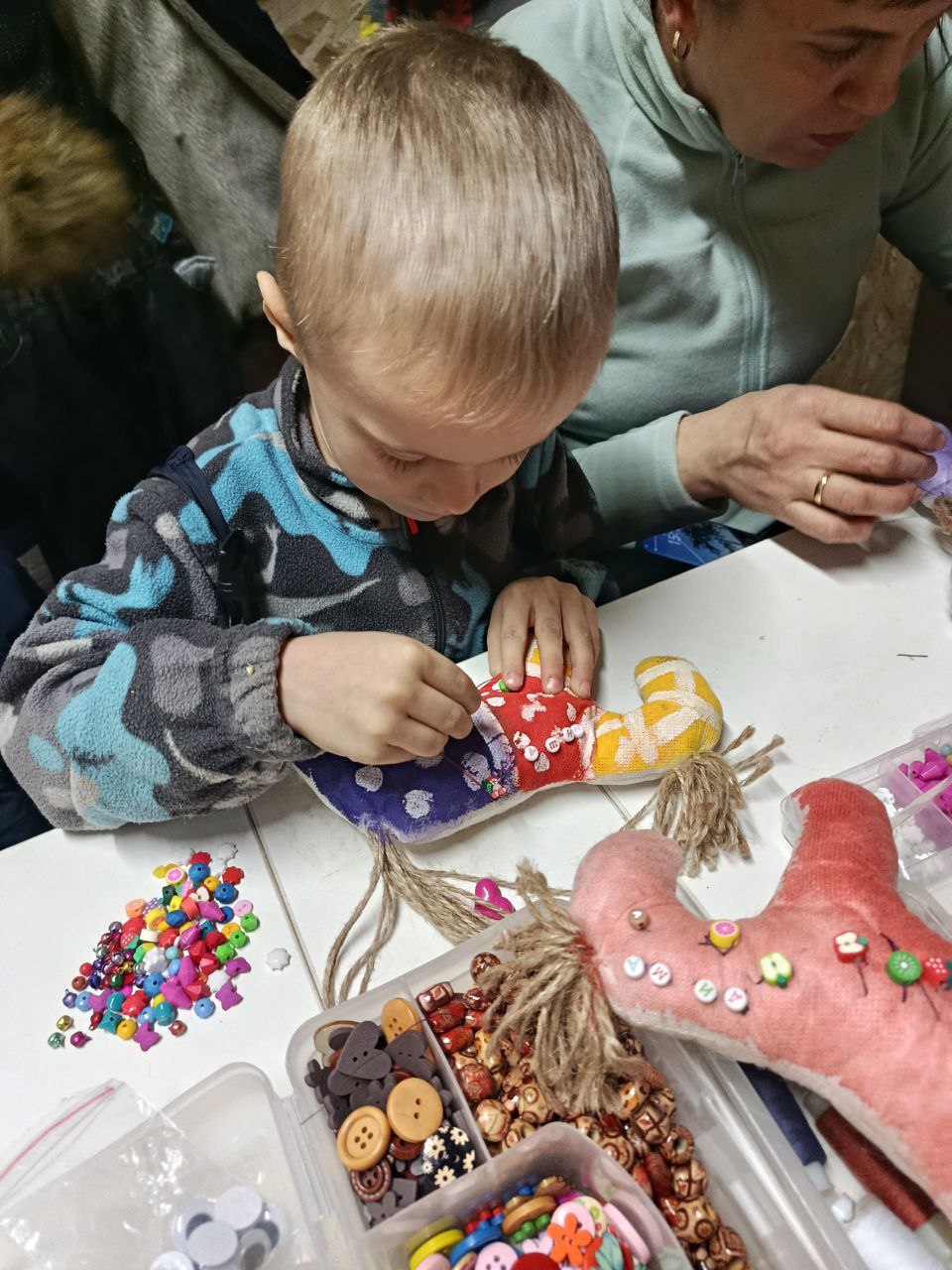 Под руководством психолога и арт-терапевта мамы и папы наполняли будущих лошадок разными крупами и бусинами, подбирали ткани на ощупь, пришивали гривы из пряжи. Дети с большим интересом наблюдали и помогали: выбирали цвета, наживляли бусины, держали материалы. Это был удивительный процесс совместного творчества, где каждая семья вложила в свою «Игогошку» частичку тепла и заботы.